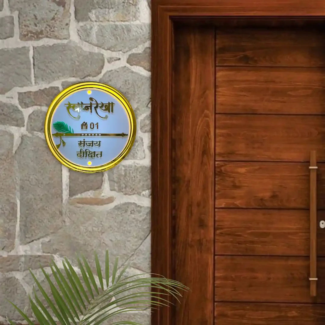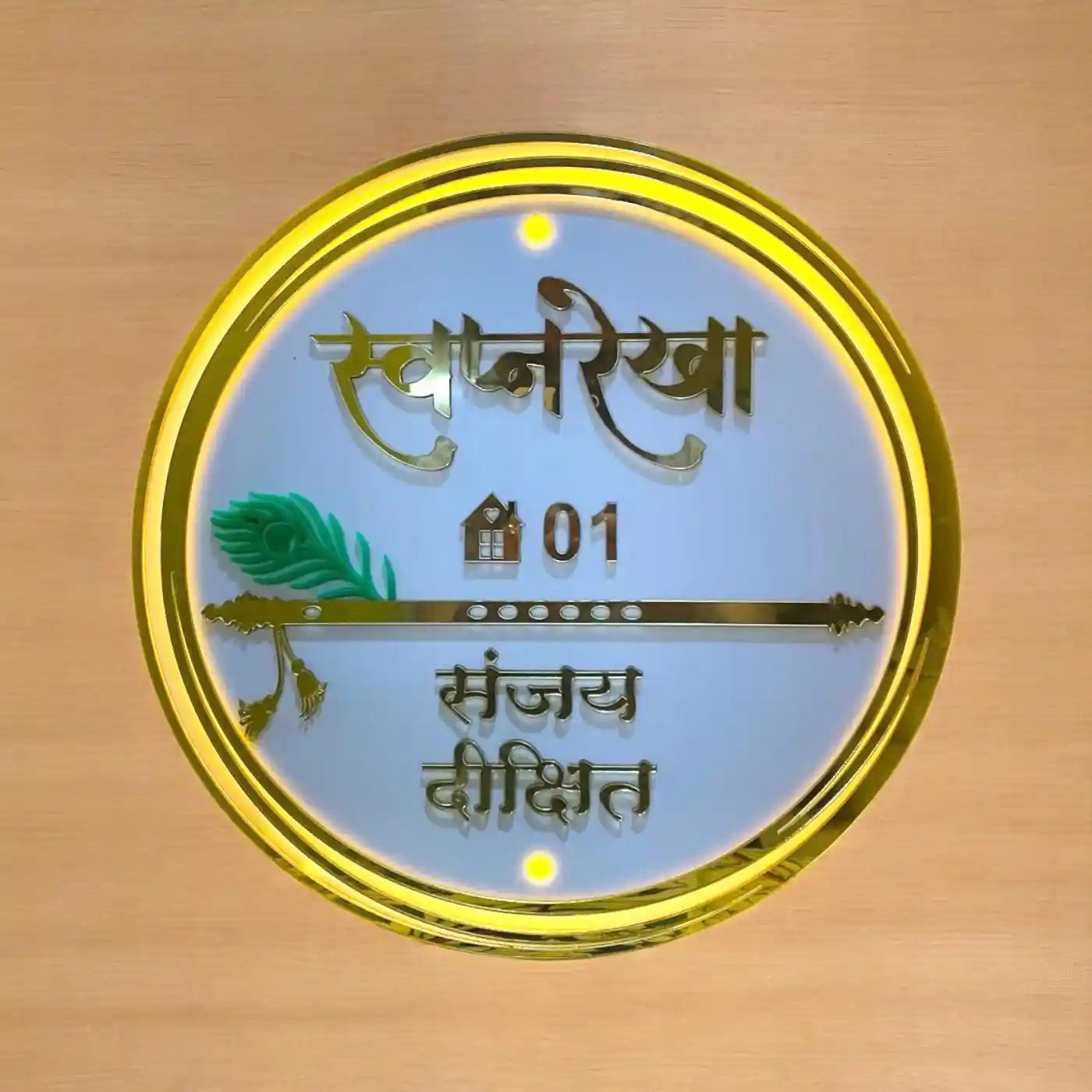 Personalized Handmade Peacock Feather And Flute Circular Acrylic Name Plate With Light
